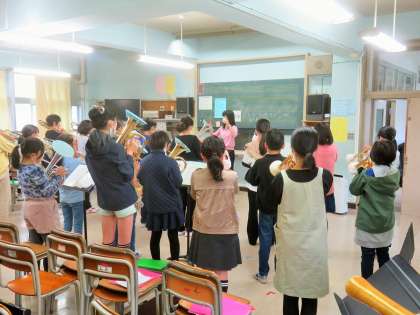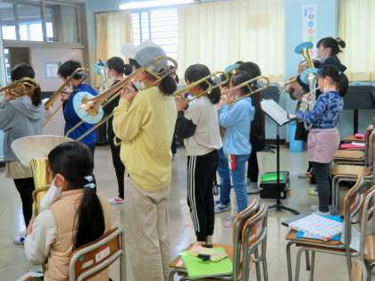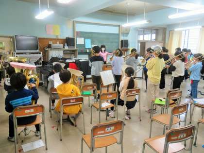 金管バンドの演奏で「1年生を迎える会」を盛り上げます!