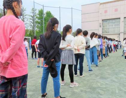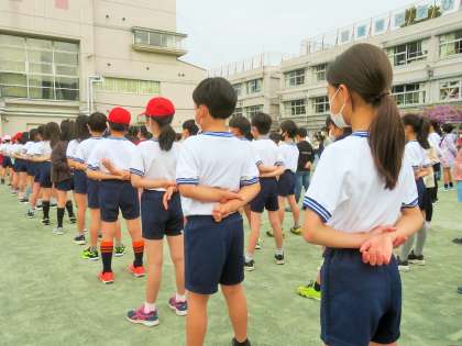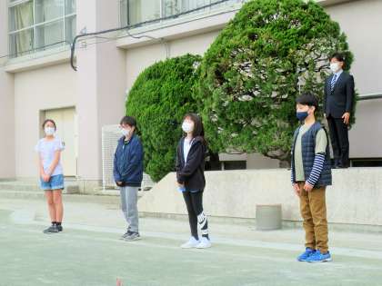 写真は、6年生のあいさつ、4年生、5年生の集中した立ち姿です。
