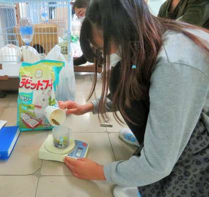 飼育委員の子どもたちは、ウサギのお世話をしてくれています。ウサギ小屋の掃除をはじめ、干し草とウサギの餌、新しい水を与えています。最後に、ウサギの健康状態も記録して引き継いでいます。