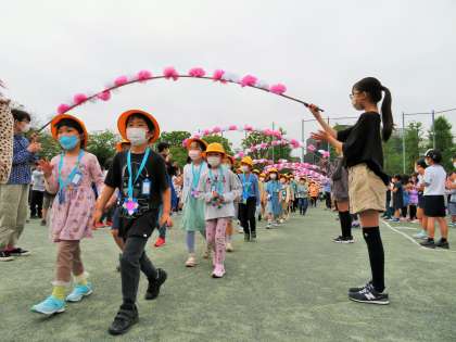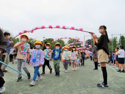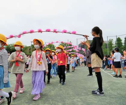 今日は、待ちに待った「1年生を迎える会」を校庭で行いました。まずは1年生が入場です。