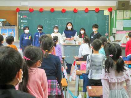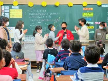 1年生を和ませようと「ものまね」をしたり「めいれいクイズ」をしたりしています。最後は「ありがとうございました。」「また来てください!」と、あいさつをしてお別れします。6年生、いつもありがとう!