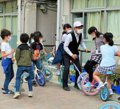 私は、3年生と一緒に初めて「一輪車」に挑戦です。何度も転倒しそうになっていますが、子どもたちからのアドバイスがうれしいです!