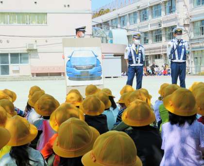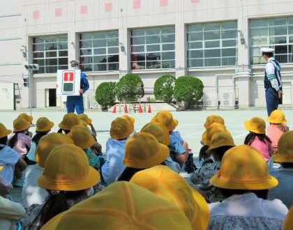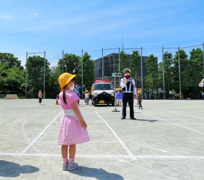 今日は1年生が、世田谷警察署の方々をお招きして、交通安全教室を行いました。横断歩道の歩き方や、駐車している車の横を通るときのポイントを学びました。