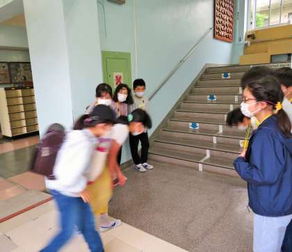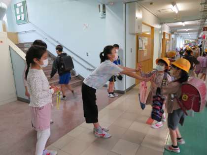今朝は「優郷の学び舎」あいさつ運動の2日目です。雨が降っていたため、昇降口付近の室内でのあいさつ運動です。