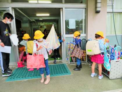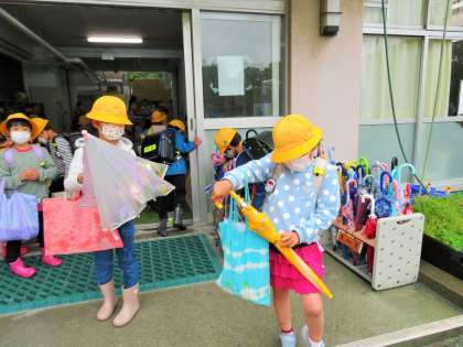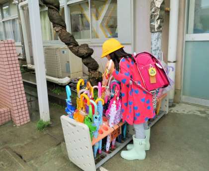 今朝は、本降りの雨の中での登校となりました。1年生は、傘をくるくる丸めて傘立てに入れたり、カッパをたたんだりと、自分でできることをどんどん増やそうとがんばっています。