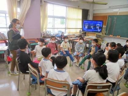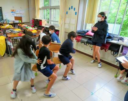 写真は、教室で「いす取りゲーム」で遊んでいる様子です。