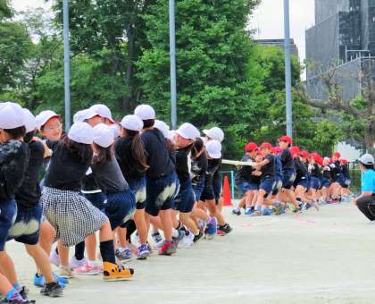 4年生の団体競技は「走れ!引っぱれ!お助けつな引きです。綱引きしている仲間に早く加勢して綱引きをしますので、綱引きしている子たちも必死ですが、加勢する子たちも必死です。