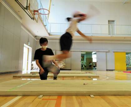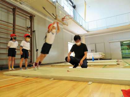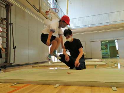 写真は、1年生「立ち幅跳び」の様子です。