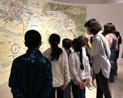 世田谷美術館では、現在「ピーターラビット展」が開催されていました。運のいい子どもたちです。観賞リーダーの学芸員さんと共に、グループに分かれて館内を巡りました。