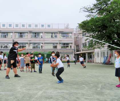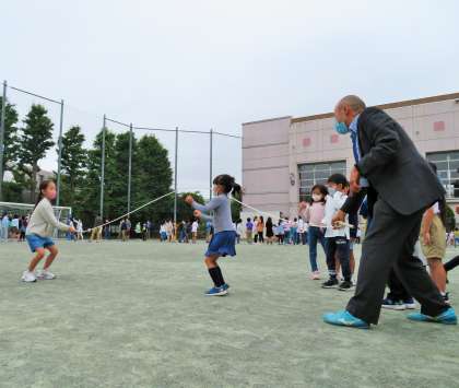 2・4・5年生体育朝会の様子です。長縄跳びは、学級のチームワークづくり、運動感覚づくりにはとてもよい運動種目なので全校で取り組みます。