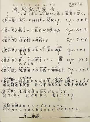 今日の児童集会は集会委員の皆さんによる「開校記念集会」です。松丘小学校は、6月14日に67歳のお誕生日を迎えます。その記念に松小の歴史に関するクイズなど、8問を考え配信してくれました。かなりの難問も含まれています。