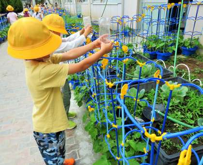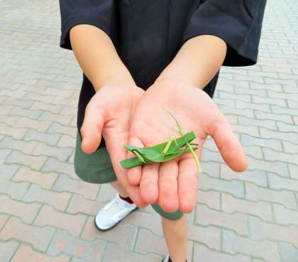 あいさつ運動が終わると、アサガオの水やりをしている1年生、そして「笹舟を作りました!」と見せてくれる2年生の姿がありました。笹の葉で上手に出来ていました!