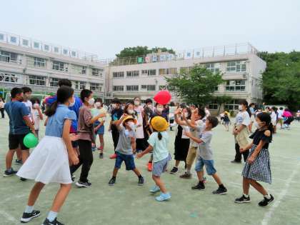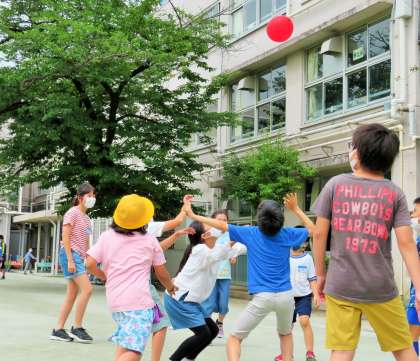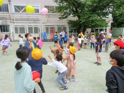 写真は、「風船バレー」で遊んでいる班の様子です。