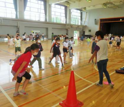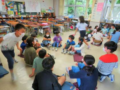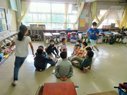 写真は、「だるまさんが転んだ」「ハンカチ落とし」で遊んでいる班の様子です。