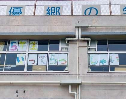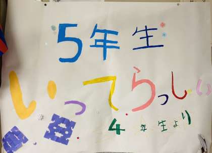 5年生の教室の黒板には4年生からのメッセージが、4年生は教室からも「5年生いってらっしゃい」の表示をしてくれていました。本当に温かい子どもたちと先生の学校です。