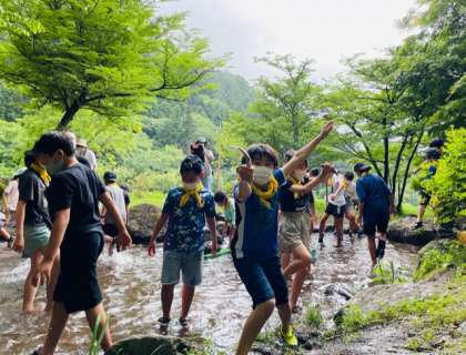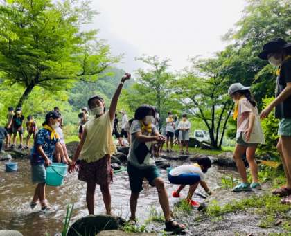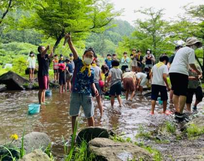 きれいで冷たい川の中に入って、ニジマスつかみに挑戦です。友達と協力しながら悪戦苦闘です。