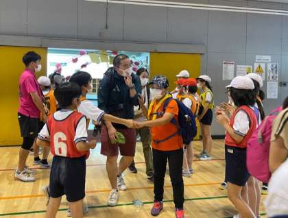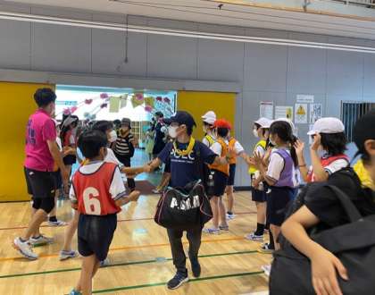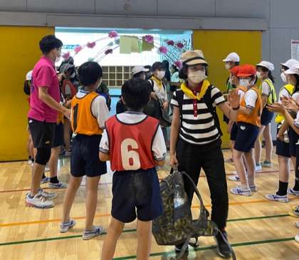 学校に到着しました。帰校式を行う体育館入口で5年生2,3組の子どもたちを「お帰りなさーい!」と、お迎えしたのは5年生1,4組の子どもたちです。