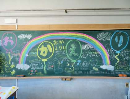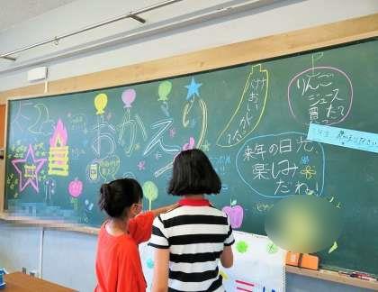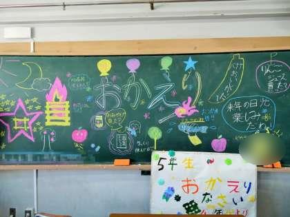 5年生2組と3組の教室の黒板には、5年生1組と4組の子どもたちからのメッセージが黒板いっぱいに書かれていました。みんなありがとう!