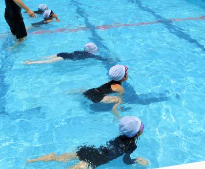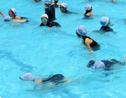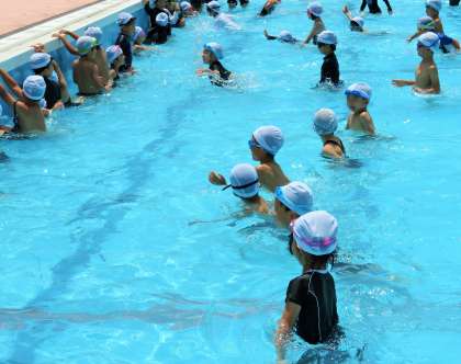 今日は絶好のプール日和です。1年生の水泳学習は、水に顔をつけたり、もぐったりしたりして、水に親しみました。水遊びの心得を守って、安全に気を付けて学習をしました。