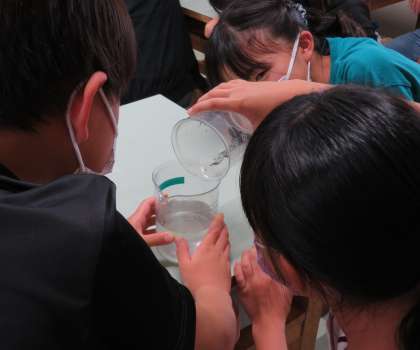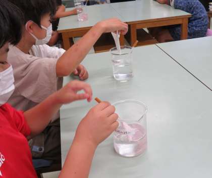 子どもたちはクイズにも元気に答えていました。次の実験で、トイレにはトイレットペーパー以外流してはいけないことがわかりました。その他、油をふき取ってからお皿を洗うなど、自分ですぐにできることも考えました。