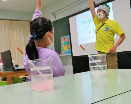 クイズや実際の動画、実験を通して、「うちも油は固めてごみに出しているよ!」「ティッシュを流すと詰まってしまうから、トイレットペーパーを使うんだね!」など、生活を振り返る姿が見られました。学習したことはすぐに実行してこそです・・・。私も実行します!