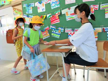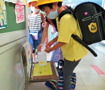 感染症の予防対策として、教室に入る際には、アルコール消毒、「健康観察カード」の提出を徹底しています。