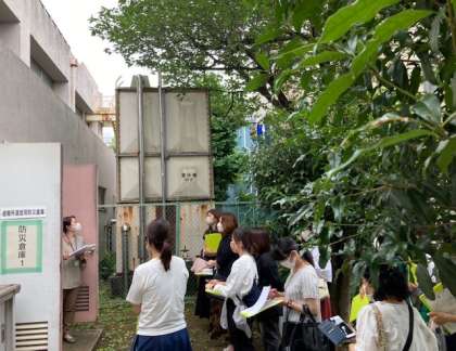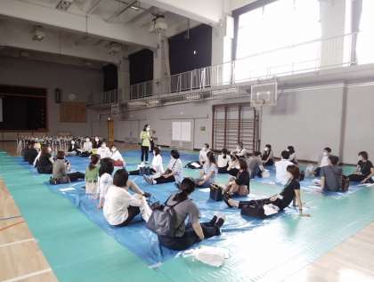 防災倉庫の見学、そして、体育館では一枚のブルーシートに、実際に10人生活する想定で座ってみましたが狭さを感じました。