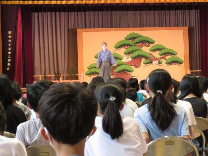 前半は、狂言について解説をしていただき、狂言「附子」を鑑賞しました。滑稽さを演じる役者さんのセリフ、動作に共感していました。可笑しな場面では、自然と笑い声が起きていました。