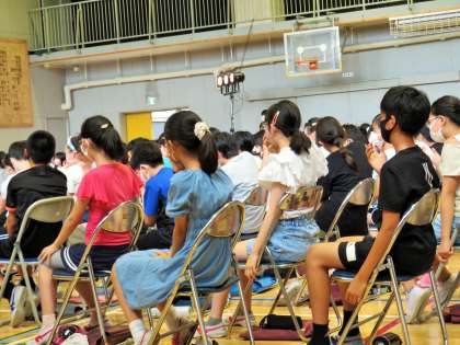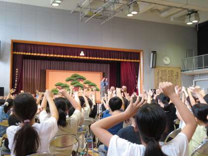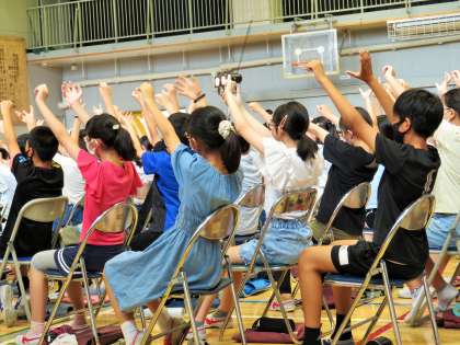 柿の実を取って食べる動きを見せていただき、自席で所作を演じました。