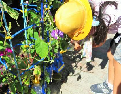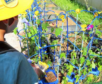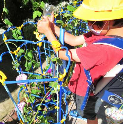 1年生の子どもたちが「きれいな花が咲きますように!」と、願いを込めて毎日のように水やりをしてきたアサガオの花がどんどん咲いています。