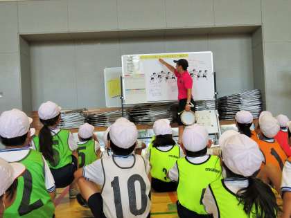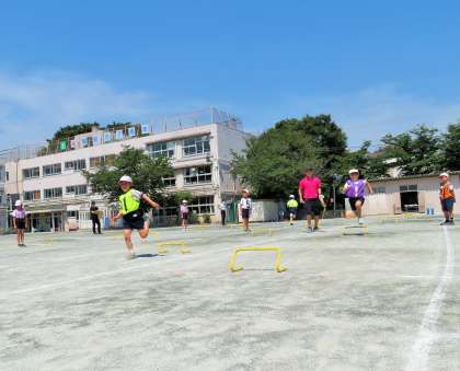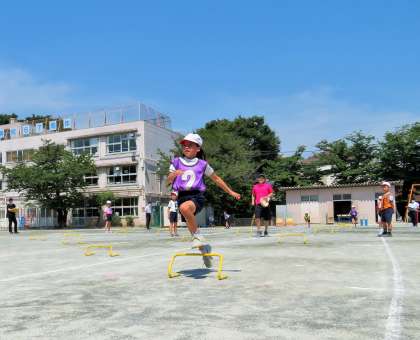 授業のめあては、「もっと速く走り越えるために、必要な動きを見付けて練習しよう」です。まずはチーム対抗戦です。子どもたちは、チームのために「小型ハードル」を全力で走り越えていました。