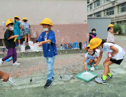 1年生は、生活科「なつをたのしもう」の学習でシャボン玉遊びをしました。朝の雨が上がりぐんぐんと良い天気になりましたので、校庭で思いっきりシャボン玉遊びをすることができました。