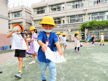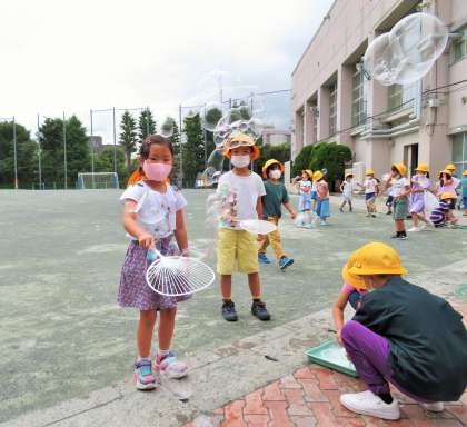 家にあるものを工夫してシャボン玉を飛ばしました。大・小、様々なシャボン玉に大きな歓声があちらこちらで聞こえました。シャボン玉を追いかけてたくさん走り回り、あっという間に時間が過ぎました!