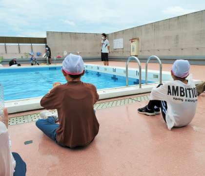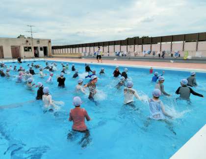 今日は5年生の水泳授業で「命を守る泳ぎ」着衣泳の学習を行いました。川や海、プールなどで溺れてしまった場合、助かる可能性をより高くするためにはどのようにすることが最善か。また、友達や家族がそのような状態になった時にどのように助けるべきか。命を守るための行動を考えました。