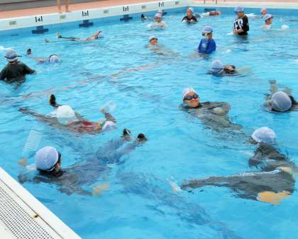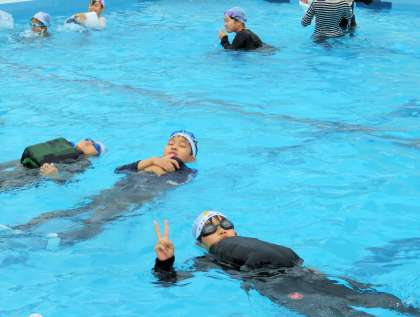 その後、浮くためには何をすればよいのかを考え、服の中に空気を入れたり、ペットボトルを活用したりすることなどを学びました。