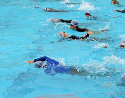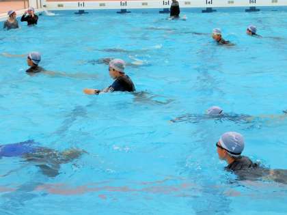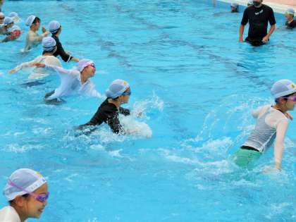 まず、子どもたちは着衣をしたまま、歩いたり、走ったり、泳いだりして、着衣状態では重くて、泳ぐことが困難なことを体験しました。