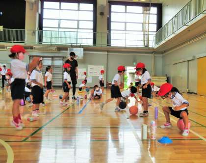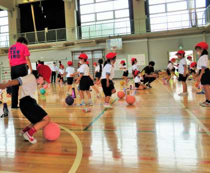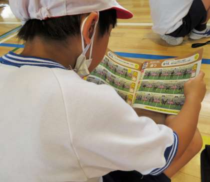 最後は、相手が蹴ったボールをお尻やひざで止めました。1年生の皆さん、よく頑張りましたね。夏休みに、お家の人と一緒に「あおあかドリル」を有効活用して、新たな動きに挑戦してほしいと思っています。
