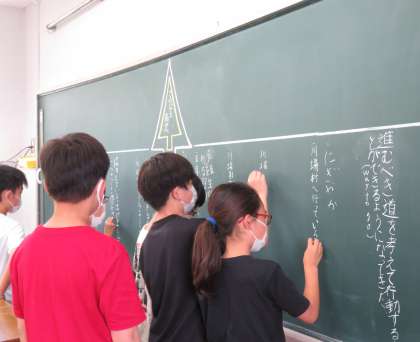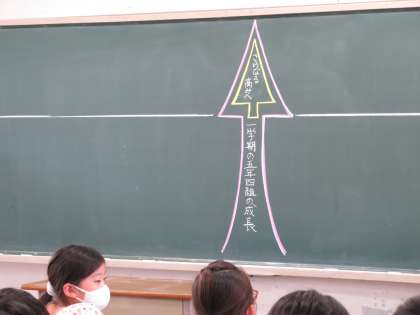 クラスの成長を振り返り、さらなる高みへと考えているクラスがありました。自分たちの頑張りを言葉にして振り返ることで、現状が把握でき、目指すところがより明確になってきます。目指すところが明確になると、クラスのために自分に何ができるかを考えることができます。この振り返りが『キャリア教育』では大切です。今日の振り返りをもとに、2学期も自分たちでよりよい学級づくりをしていけるようにしていきます。