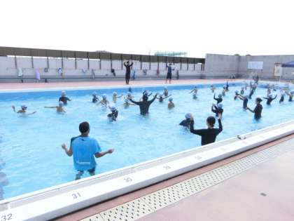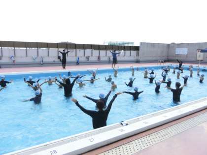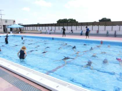 今日は夏季水泳教室8日目です。今日も絶好のプール日和になりました。写真は、ウォーミングアップの様子です。