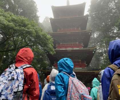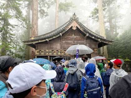世界遺産の日光東照宮に到着しました。案内人の方が説明をしてくださり、子どもたちも真剣に聞いています。