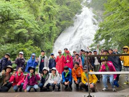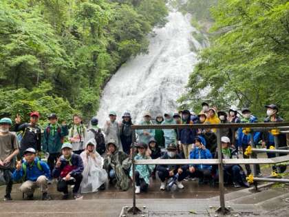 湯滝に到着しました。湯ノ湖から流れ落ちる落差50mの豪快な滝です。清涼感をみんなで満喫しました。