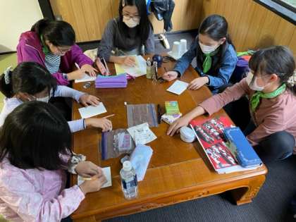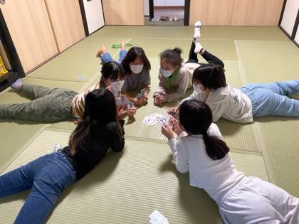 早めにホテルに戻ってゆったりと過ごしています。露天風呂付きの天然温泉に入ったりカードゲームをしたり、葉書を書いたりしています。家族や親戚の人のことをしっかり考えながら書いている姿があり、温かな気持ちになりました。