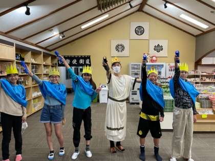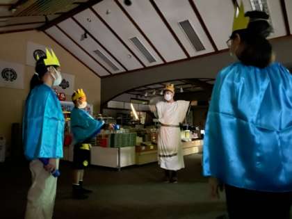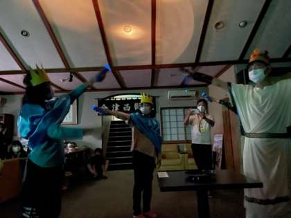 今日の夜は、雨天のため「オンライン室内レク」(キャンプファイヤー)です。東照宮から来た火の神から「友情の火」「一致団結の火」「最高の火」「絆の火」をいただき点火、そしてレクがスタートしました。