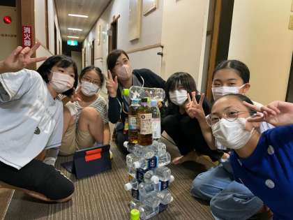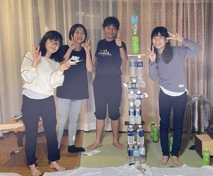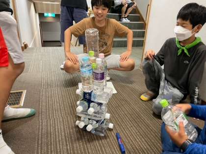 写真は、「ペットボトル積み上げチャンピオン大会」の様子です。