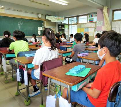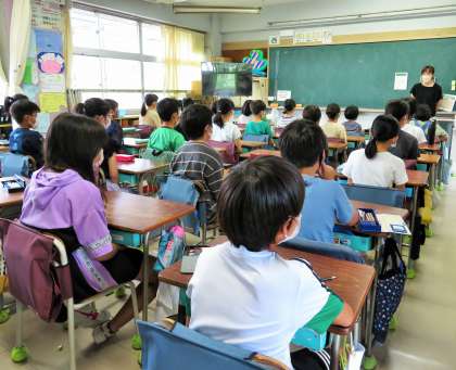 写真は、全校朝会の話を聞いている4年生の様子です。