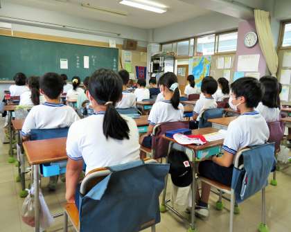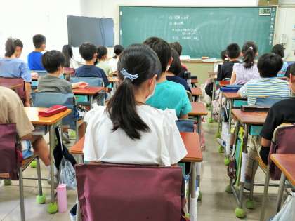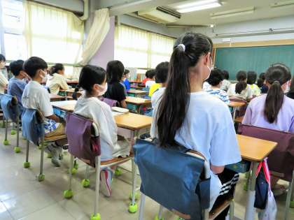 写真は、全校朝会の話を聞いている5年生の様子です。