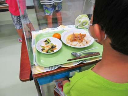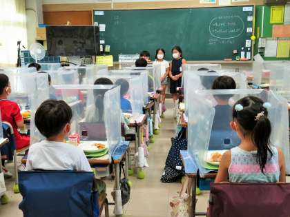2学期はじめての給食にワクワクドキドキです。学校では飛沫防止策として、パーテーションを設置して給食です。「いただきます!」をしてからマスクを外し、黙食をがんばっています。