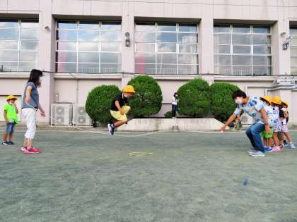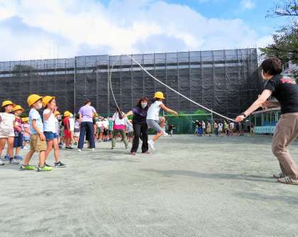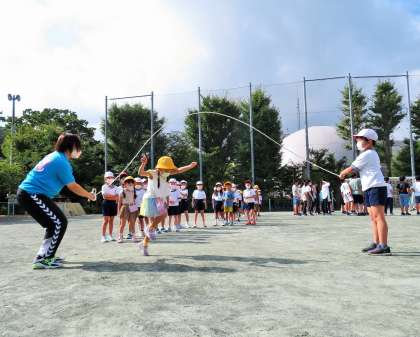 今日は、1・3・6年生の体育朝会です。長縄跳びは、学級のチームワークづくり、運動感覚づくりにはとてもよい運動種目なので全校で取り組みます。