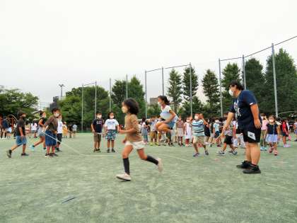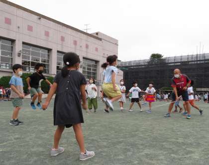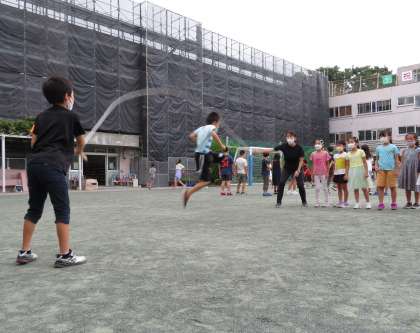 今日は、2・4・5年生の体育朝会です。長縄跳びは、学級のチームワークづくり、運動感覚づくりにはとてもよい運動種目なので全校で取り組みます。