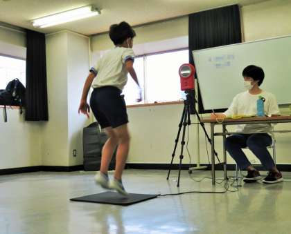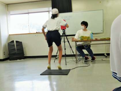 写真は、反応時間に挑戦している5年生の様子です。光が光ったらジャンプする、その反応時間を測定しています。
